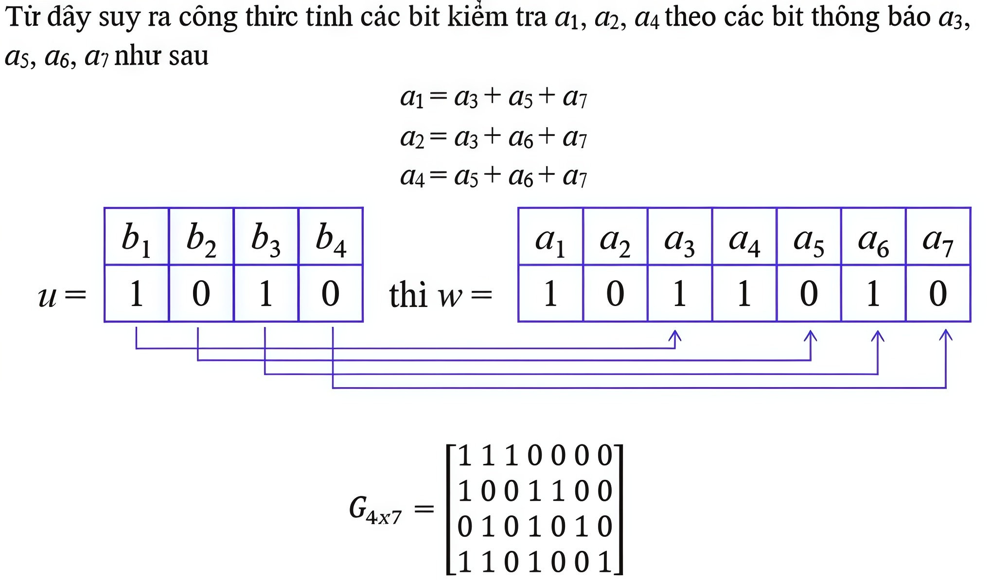 Xét mã tuyến tính Hamming C(7, 4) có các bit thông tin nằm ở các vị trí 3, 5, 6, 7. Hãy xác định ma trận sinh G của bộ mã.