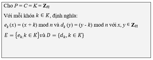 Ví dụ: Để mã hóa một thông điệp được biểu diễn bằng các chữ cái từ A đến Z (26 chữ cái), ta sử dụng P = C = K = Z26. Khi đó, thông điệp được mã hóa sẽ không an toàn và có thể dễ dàng bị giải mã bằng cách thử lần lượt 26 giá trị khóa k Î K. Tính trung bình, thông điệp đã được mã hóa có thể bị giải mã sau khoảng n /2 lần thử khóa k Î K.