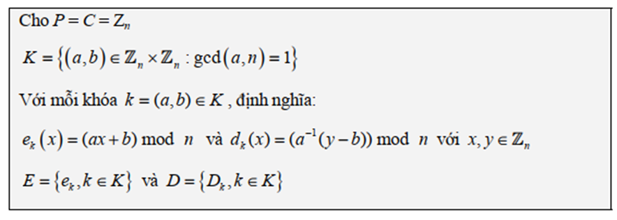 Để có thể giải mã chính xác thông tin đã được mã hóa bằng hàm thì ek phải là một song ánh. Như vậy, với mỗi giá trị phải có nghiệm duy nhất .